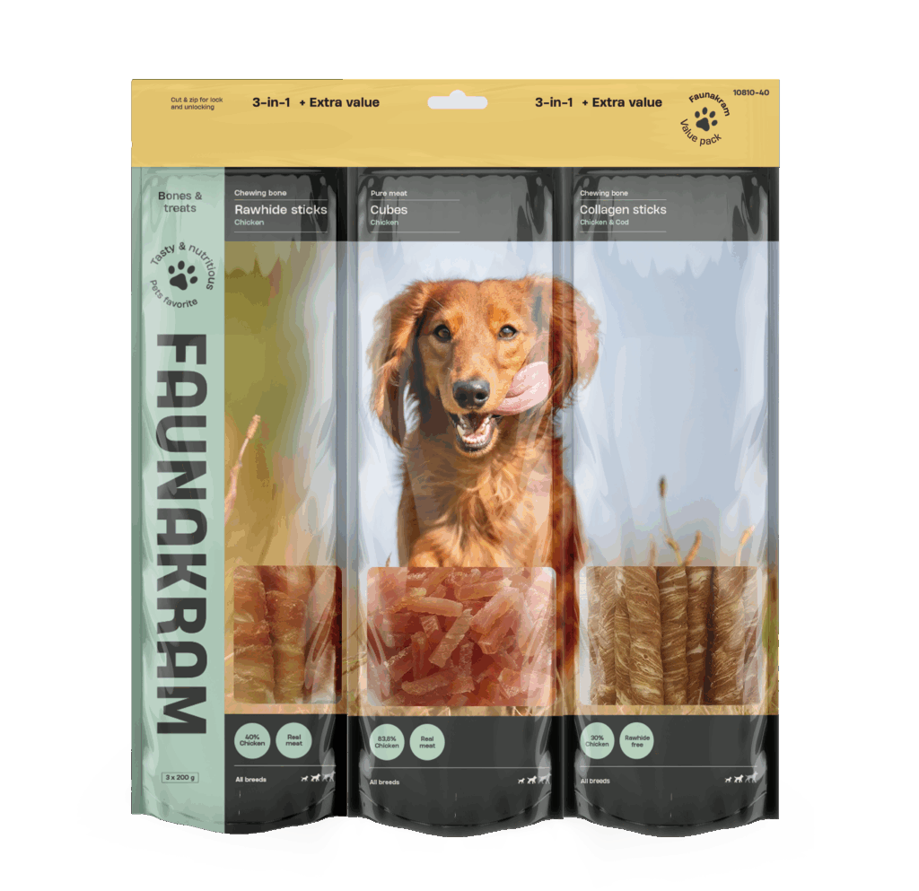 Fôringsveiledning: Som belønning mellom måltider. Juster fôrinntak etter behov. Sørg for at hunden alltid har adgang til friskt drikkevann. Hold hunden under oppsyn når den spiser. Oppbevares kjølig og tørt. Dyrefôr skal ikke inntas av mennesker.