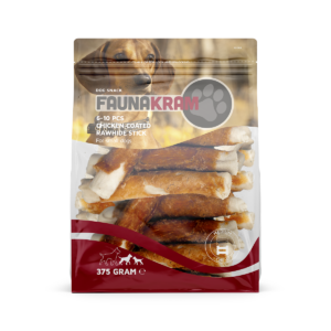 Läckert och tuggtåligt råhudsben klädd med delikat kycklingpasta. Passar såväl mellan som mindre hundraser. När hunden gnagat av kycklingpastan ger benet både sysselsättning och bra gymnastik för tänder och tandkött.