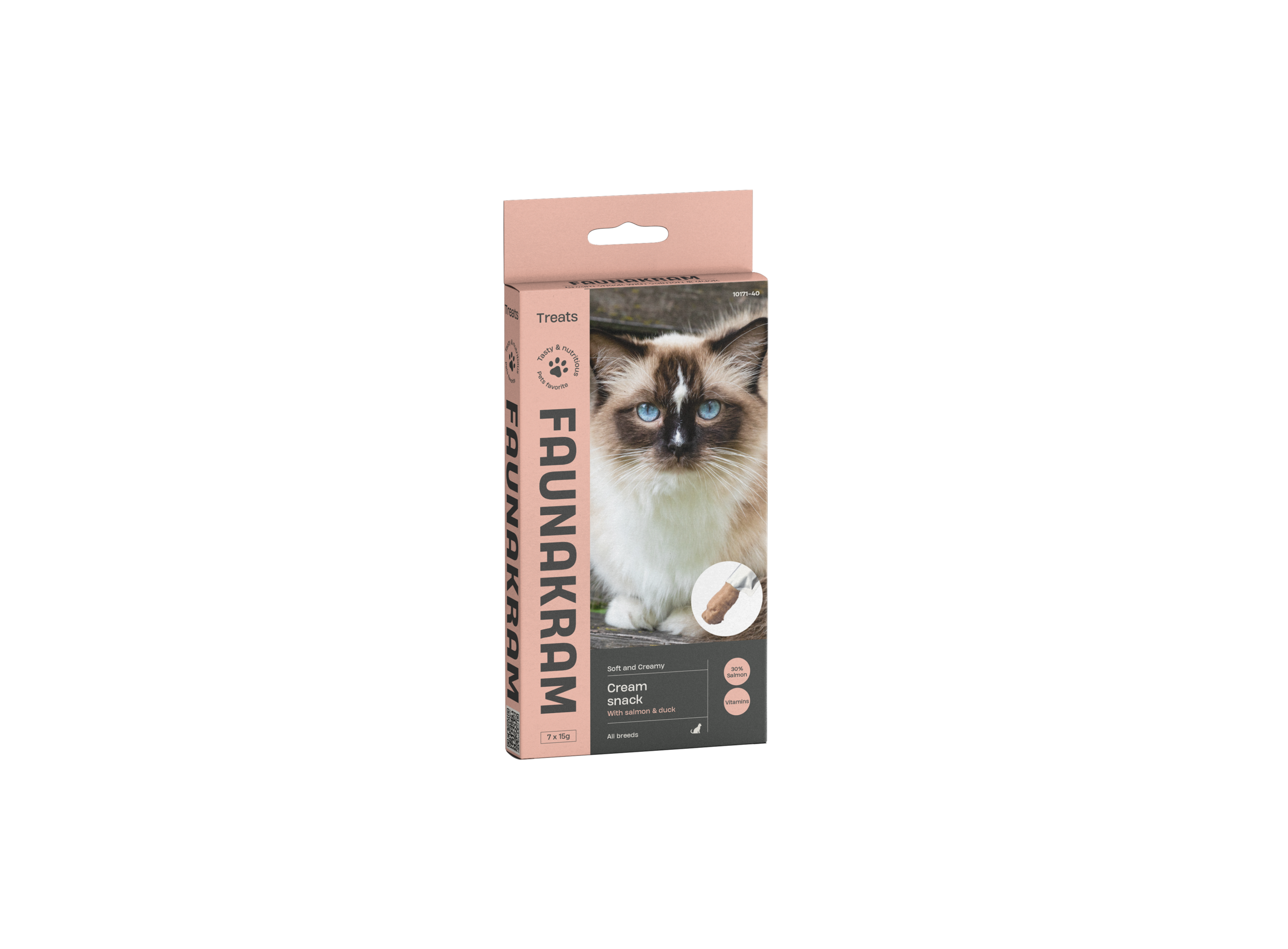 Faunakram cream Cat Snack adskiller sig fra andre godbidder til katte på markedet ved dens bløde og cremede formel. Denne formel gør det nemt at give godbidden til din kat ved at presse den ønskede mængde ud på deres mad eller direkte fra tuben, mens katten sidder på skødet og hygger sig. Netop denne snack smager af laks og and.