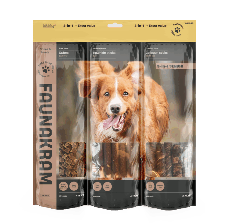 Produktet er desuden tilsat vitamin D og E, for at sikre hunden får dækket sine ernæringsbehov.