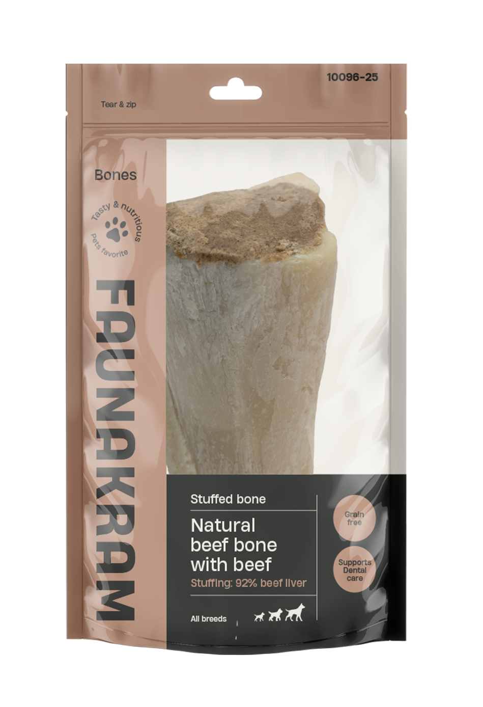 Faunakram fyldte kødben - her med fyld med 92% okselever - hører ind under vores sortiment af NATURLIGE SNACKS, som er udviklet til hunde, der kræver lidt ekstra stimulering.