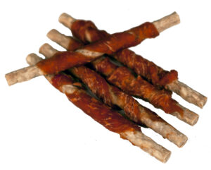 Holmegården’s naturlige munchy Stick tyggeben af oksehud med velsmagende kyllingewrap er en let tyggelig og glutenfri snack, som også er velegnet til mindre hunde.