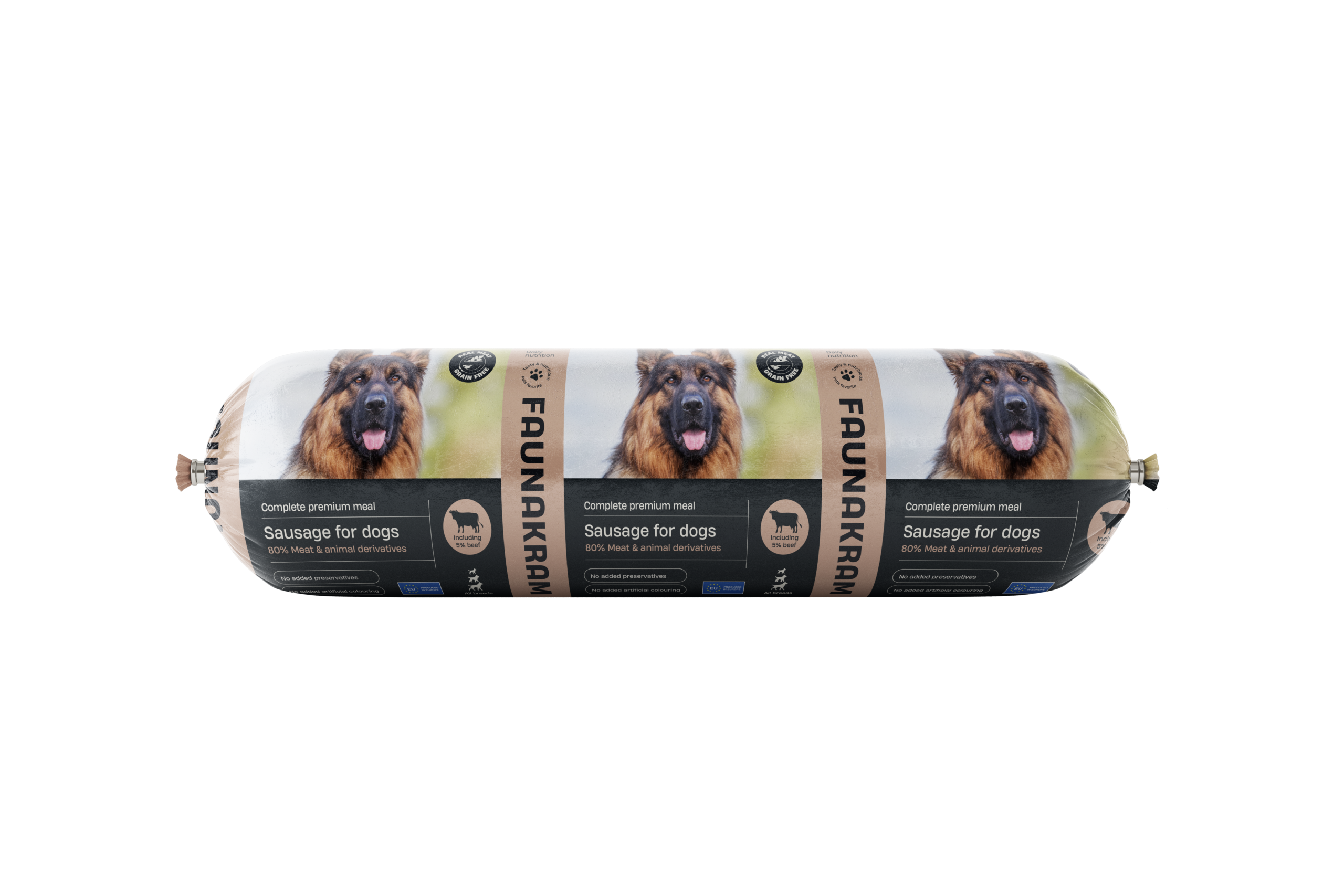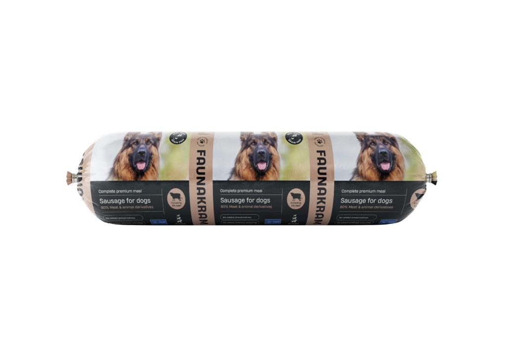 Faunakrams hundepølse inneholder et komplett våtfôr, med alle de vitaminer og mineraler, som hunden din trenger. Du behøver derfor egentlig ikke å fôre din hund med annet enn denne pølsen. Vi anbefaler derimot også å gi din hund tørrfôr, samt tyggeben, for å støtte god tannhygiene.